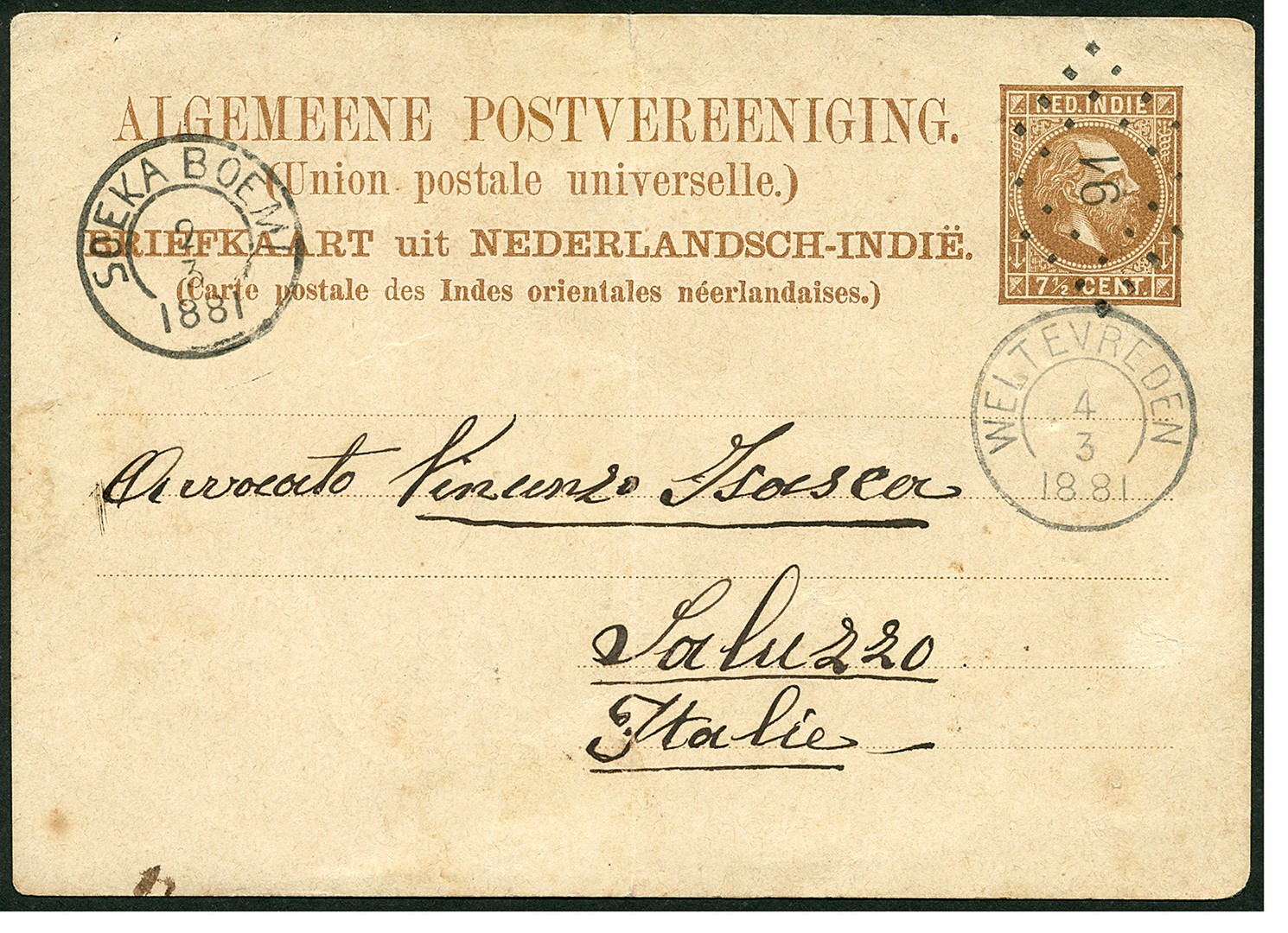 ITALIË. Bk. G5 (vert. vouw) geschreven te Tjibadak 2-3-1881 via Tjandjoer 3-3 en Soekaboemi 2-3-1881 (mooie afdruk puntstempel 91) over Weltevreden en Torino 11-4 naar Saluzzo