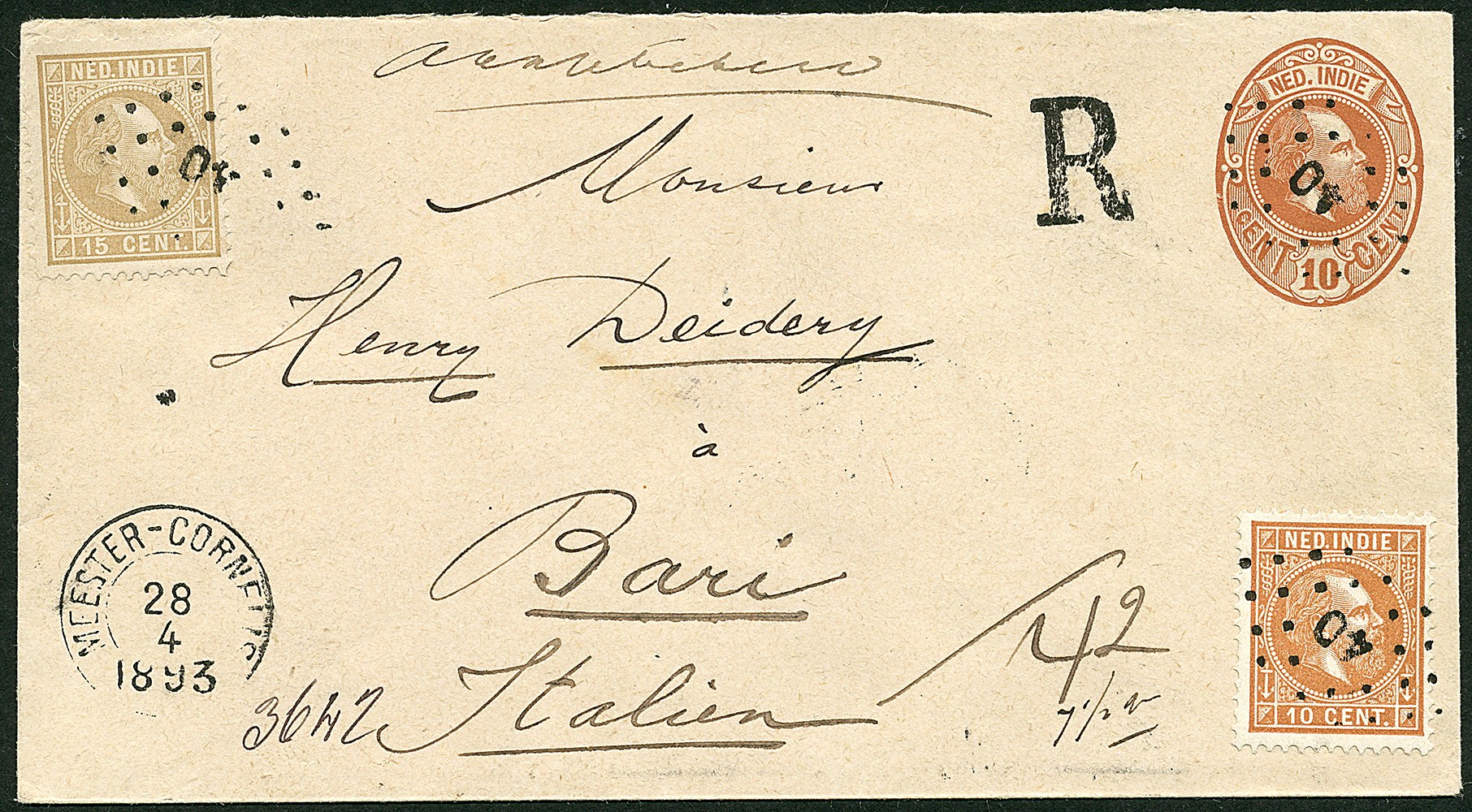 ITALIË. 10 Cent nr. 9K en 15c nr. 11F op env. G6 van 7½ gr. aangetekend van Meester-Cornelis 28-4-1893 via Weltevreden naar Bari 26-5. Mooi poststuk en een laat gebruik van zowel het kleinrond- als puntstempel!