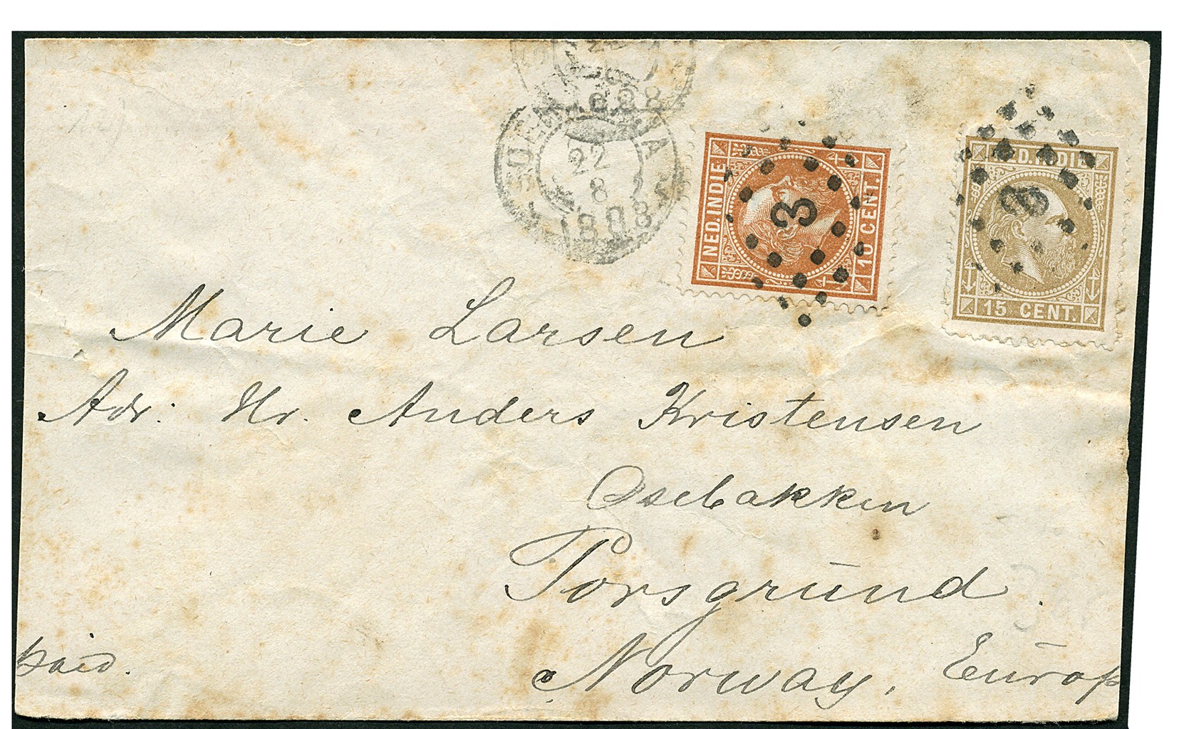 NOORWEGEN. 10 Cent nr. 9F en 15c nr. 11F op smoezelige, links en rechts wat ingekorte env. van Soerabaja 22-8-1888 over Weltevreden 25-8 naar Osebakken, Porsgrund (= Porsgrunn). Zeer zeldzame bestemming