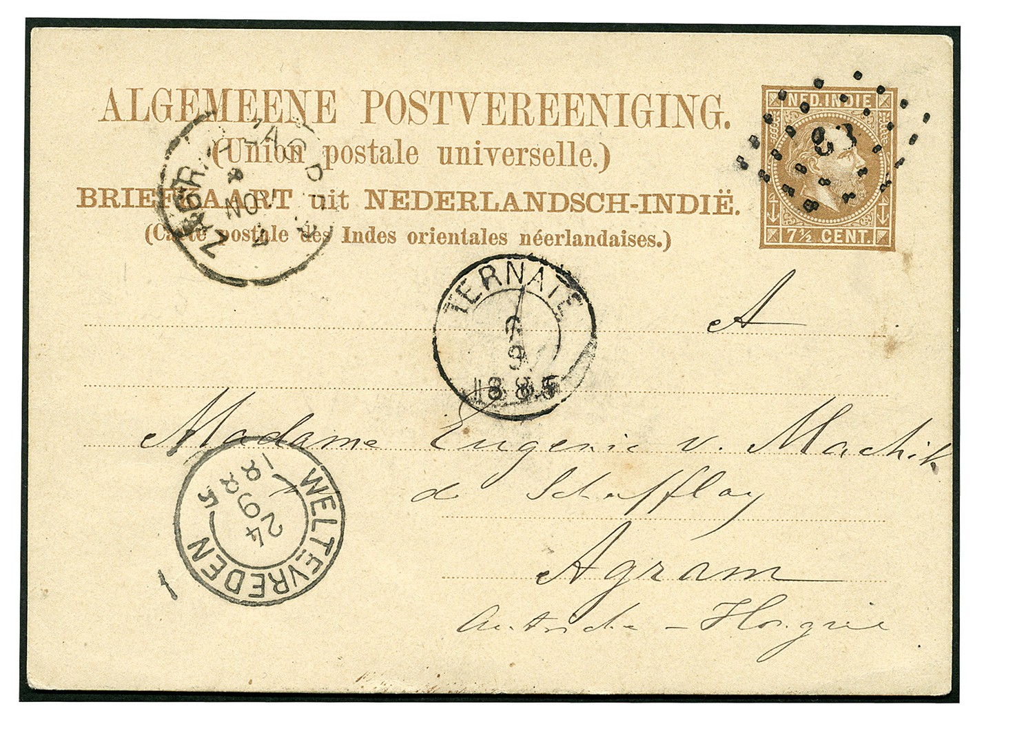 OOSTENRIJK-HONGARIJE. Bk. G5 van Ternate 6-9-1885 via Weltevreden 24-9 naar Agram, Kroatië, dat stempelde met Zagreb 4(?)-11. De kaart is geschreven door zoon Julius en gericht aan zijn moeder Eugenie