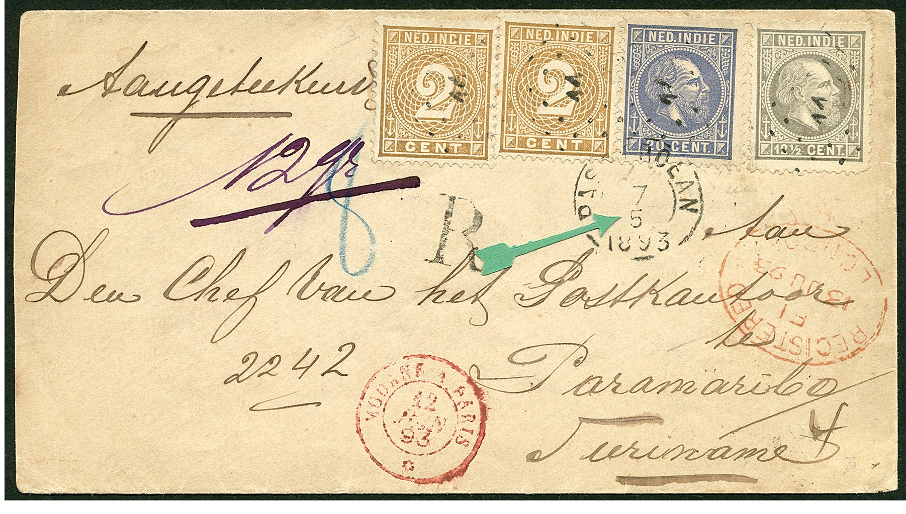 AMERIKA. SURINAME. 12½ Cent nr. 10H, 20c nr. 12F en 2c nr. 18A (2x) op env. van 12 gr. aangetekend van Pasoeroean 7-5-1893 (laat gebruik van punt- en kleinrondstempel!) via Soerabaja en Weltevreden 10-5 per traject Modane à Paris 12-6 over Londen 13-6 naar de kantoorchef te Paramaribo 7-7. Zeldzame 3-kleurenfrankering (1½ cent te veel) op bijzonder poststuk