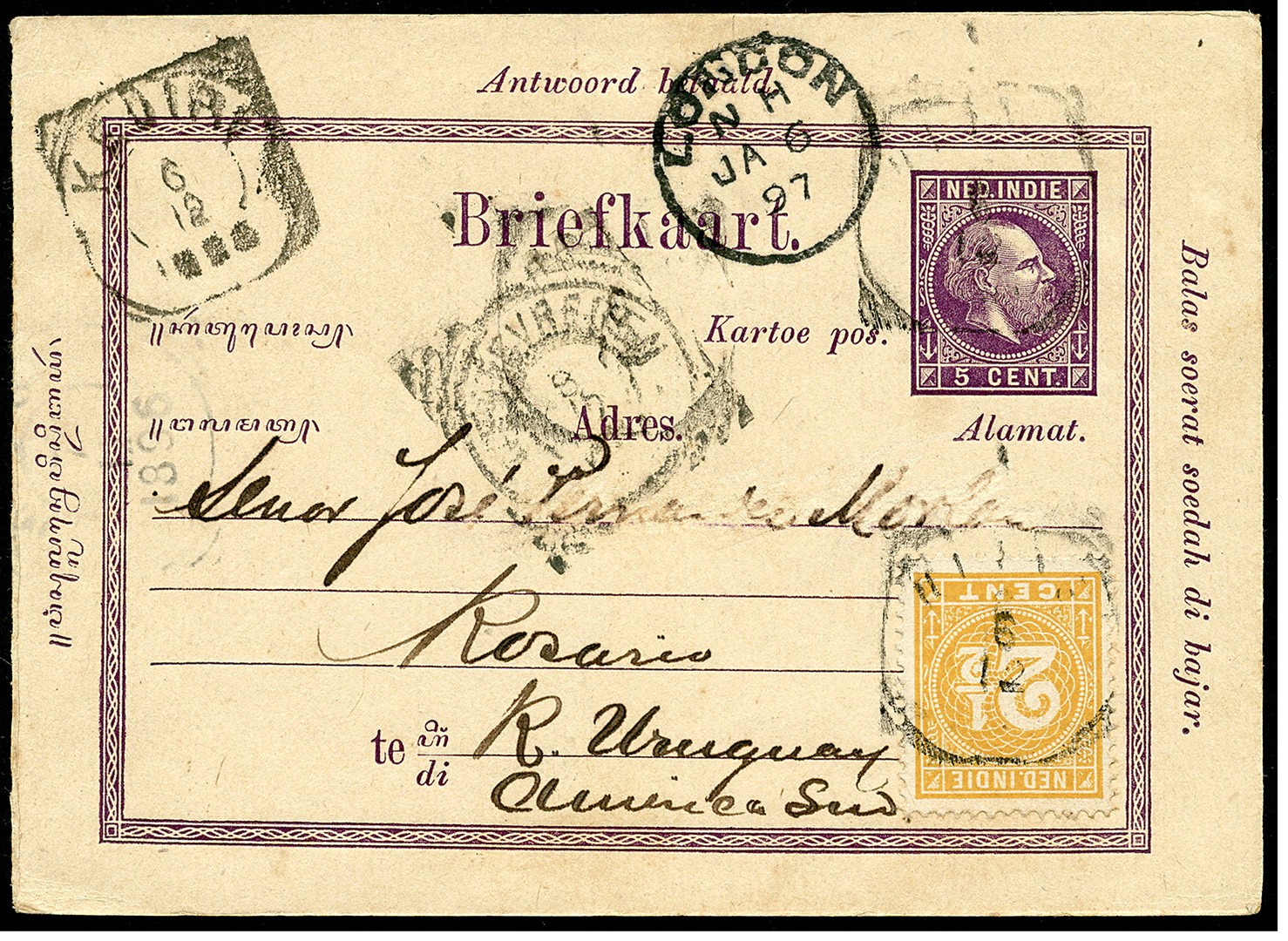 AMERIKA. URUGUAY. 2½ Cent nr. 19D op bk. G2b (V-kaart) van Wlingi 6-12-1896 via Kediri, Maos en Weltevreden 8-12 over Londen 6-1-1897 naar Rosario