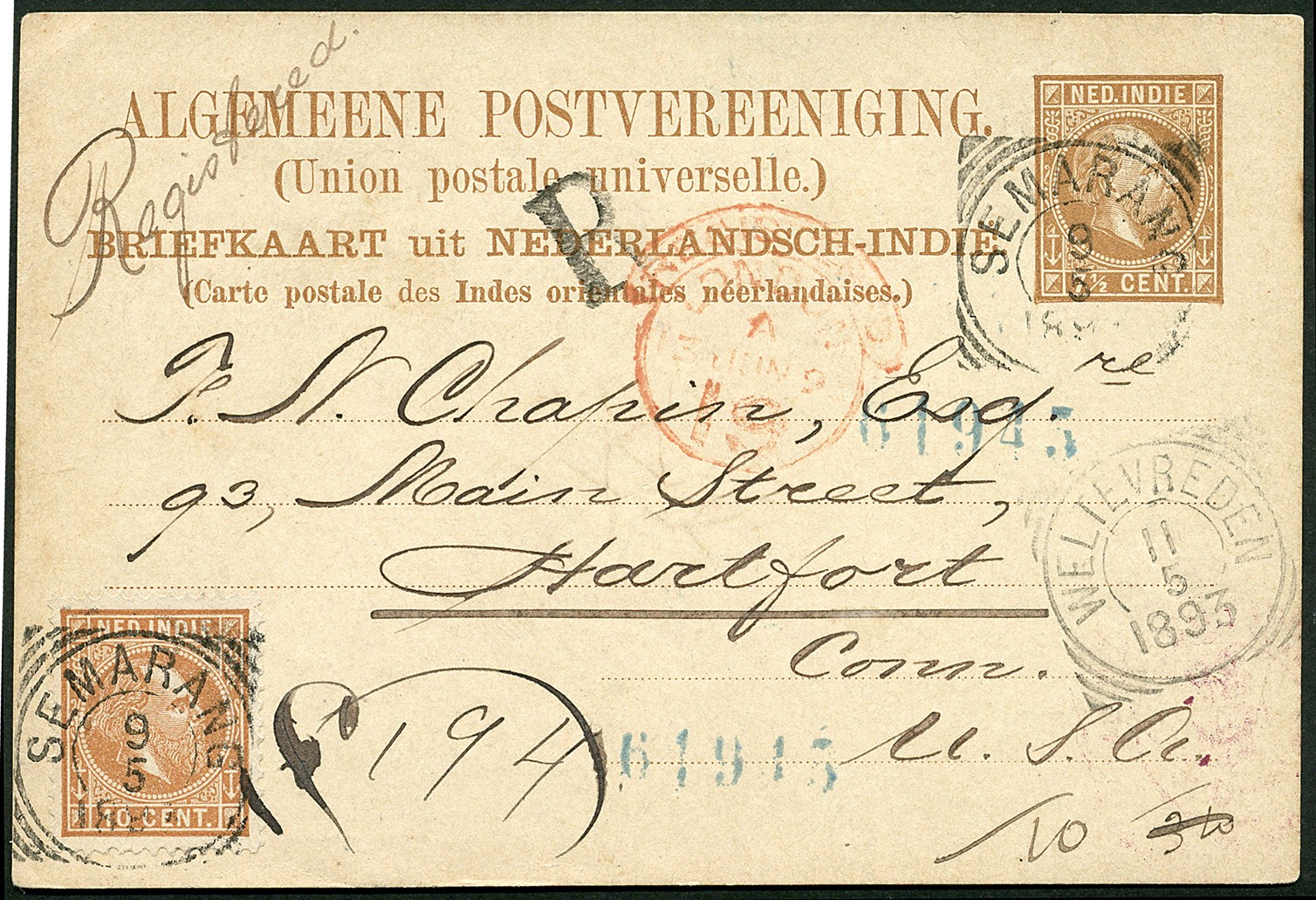 AMERIKA. USA. 10 Cent nr. 9F op bk. G5 aangetekend van Semarang 9-5-1893 via Weltevreden, Londen 13-6 en New York 21-6 naar Hartford 22-6