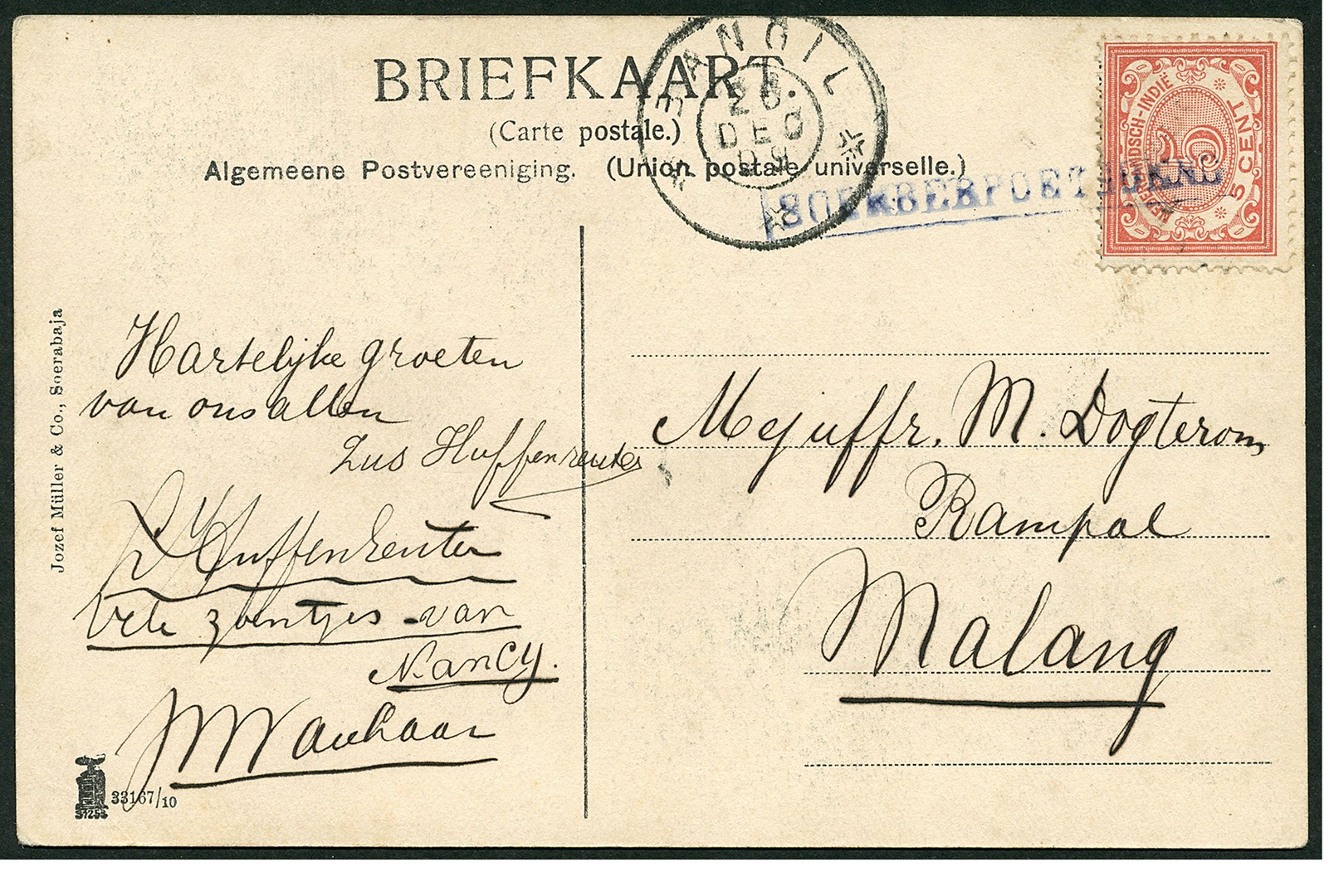 Prentbk. gefr. met 5c afgest. met haltestempel SOEMBERPOETJOENG via Bangil 20-12-1909 naar Malang