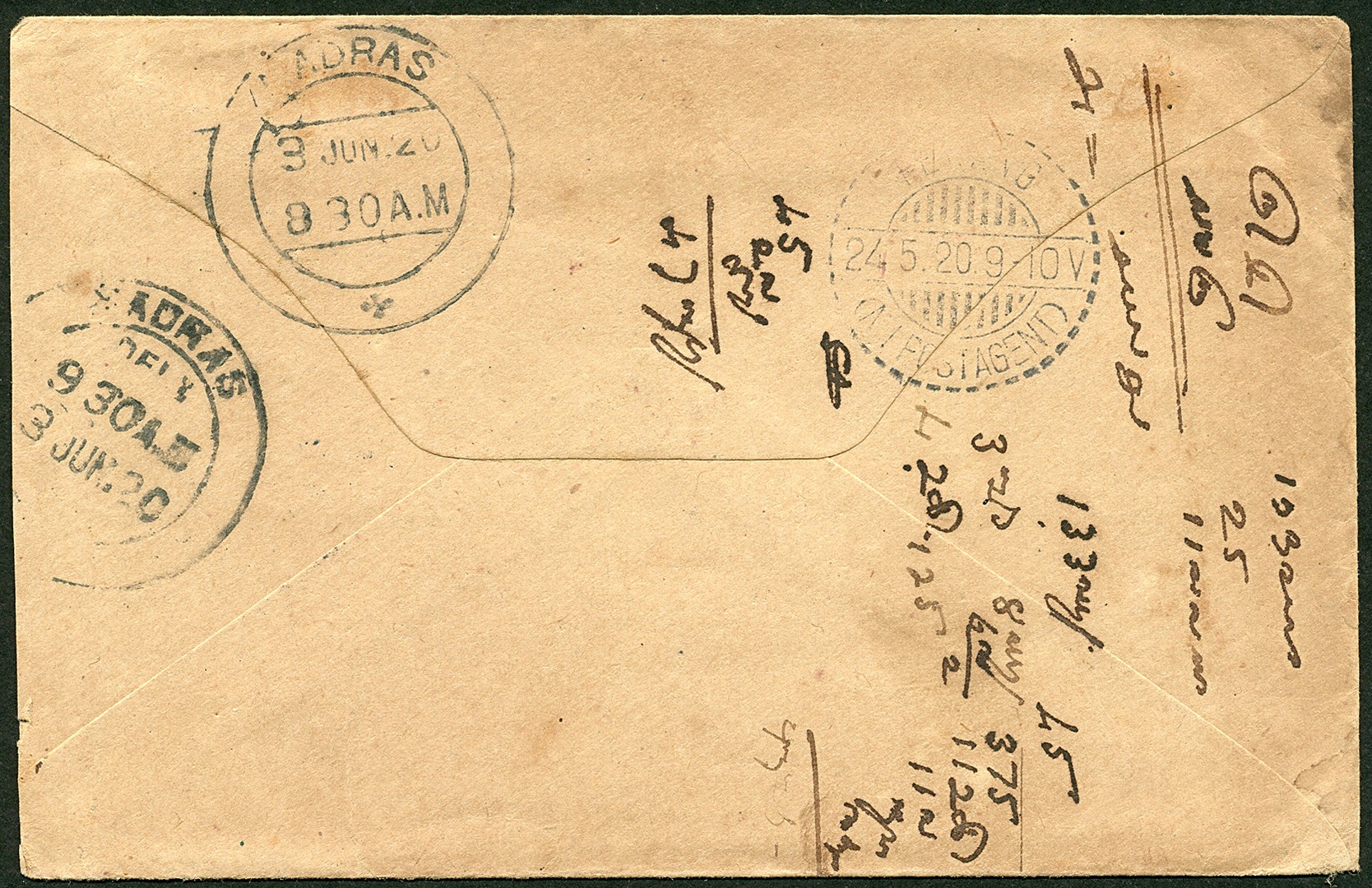 N.I. Postagent / Penang 7-7-1914 (KB, SvL 75) op env. naar India, alsmede PENANG / (N.I.POSTAGENT) 24-5-1920 (LB, SvL 350) op env. naar India
