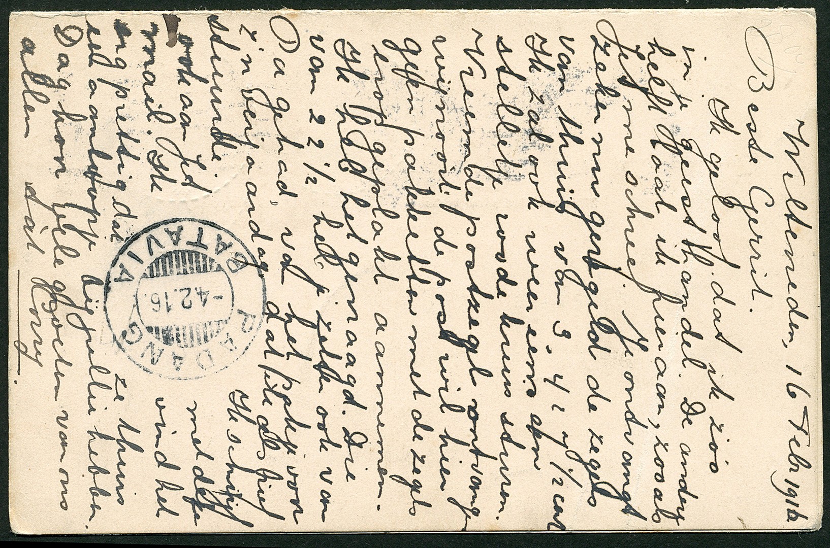 Zeesorteerkantoren. Mooie afdruk PADANG / BATAVIA -4.2.16 (Bu. RR) op az. Nederlandse dubbele bk. naar Weltevreden, alsmede zwakke afdruk SINGAPORE / BATAVIA 22.8.15 (Bu. RRR) op Ned. env. naar Weltevreden