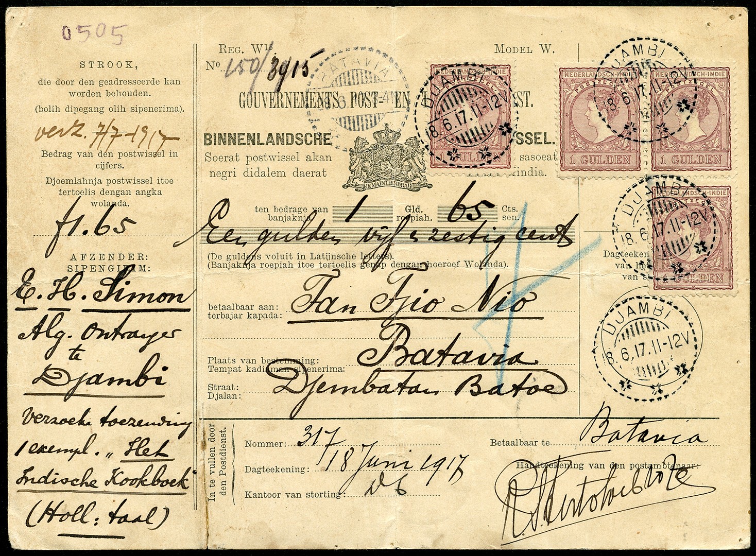 Binnenlandse postwissel met strook waarop 4 zegels van 1 gulden, afgest. Djambi 18-6-1917 naar Batavia 28-6. Het uit te betalen bedrag was ƒ 1,65 waarvoor een recht bestond van 12½ cent (zie: SvL, NITAR 185). De frankering ziet er authentiek uit, maar is door ons niet te verklaren. Ondanks diverse vouwen (waarvan 1 door onderste zegel) en een scheurtje onder bij de strook, een fascinerend en uitermate zeldzaam poststuk dat nader onderzoek verdient
