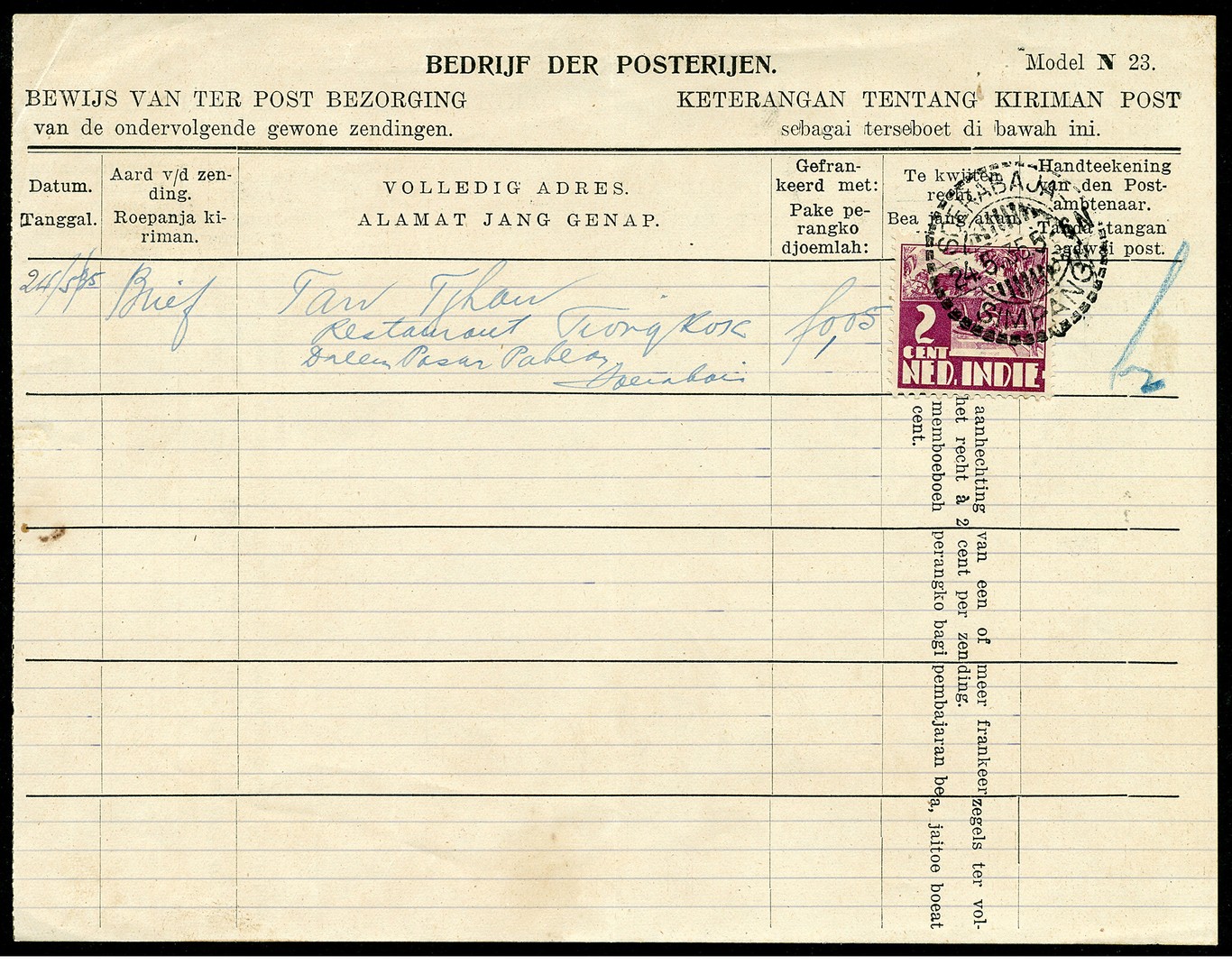 Bewijs van Ter Post Bezorging (formulier Model N 23) voor een gewone, binnen Soerabaja verzonden brief (lokaal tarief 5 cent), waarop het recht van 2 cent is voldaan met een Kreislerzegel, afgest. Soerabaja- / Simpang 24-5-1935. Ons zijn slechts een paar van dergelijke formulieren bekend (zie: SvL, NITAR 157-159)