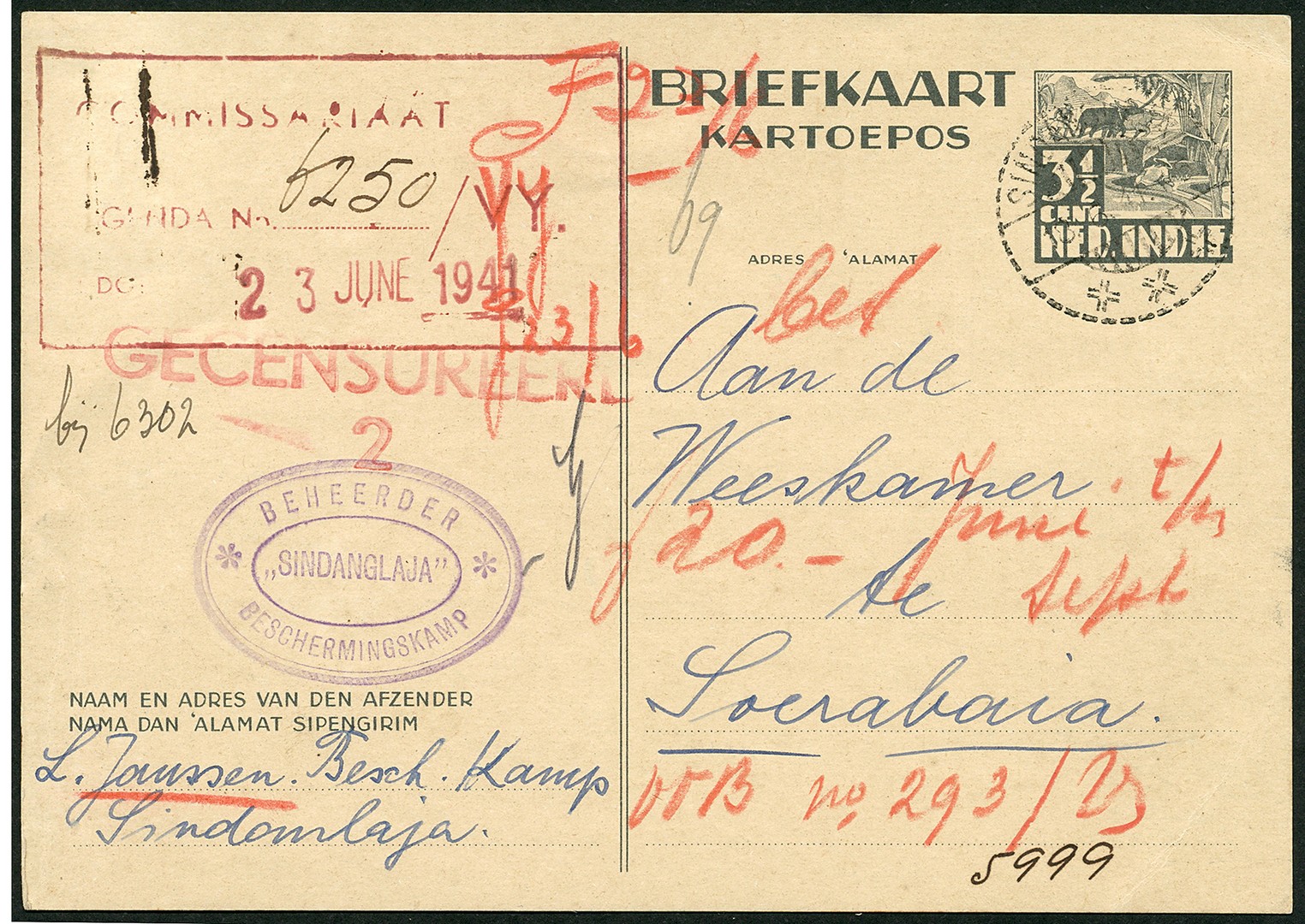 Beschermingskampen. Ovaalstempel 'BEHEERDER / BESCHERMINGSKAMP / "SINDANGLAJA"' (deW.KB E, bk. geschreven op 16 mei) op gecensureerde bk. via Sindanglaja 18-6-1941 naar Soerabaja. Prachtafdruk van dit zeer zeldzame stempel!