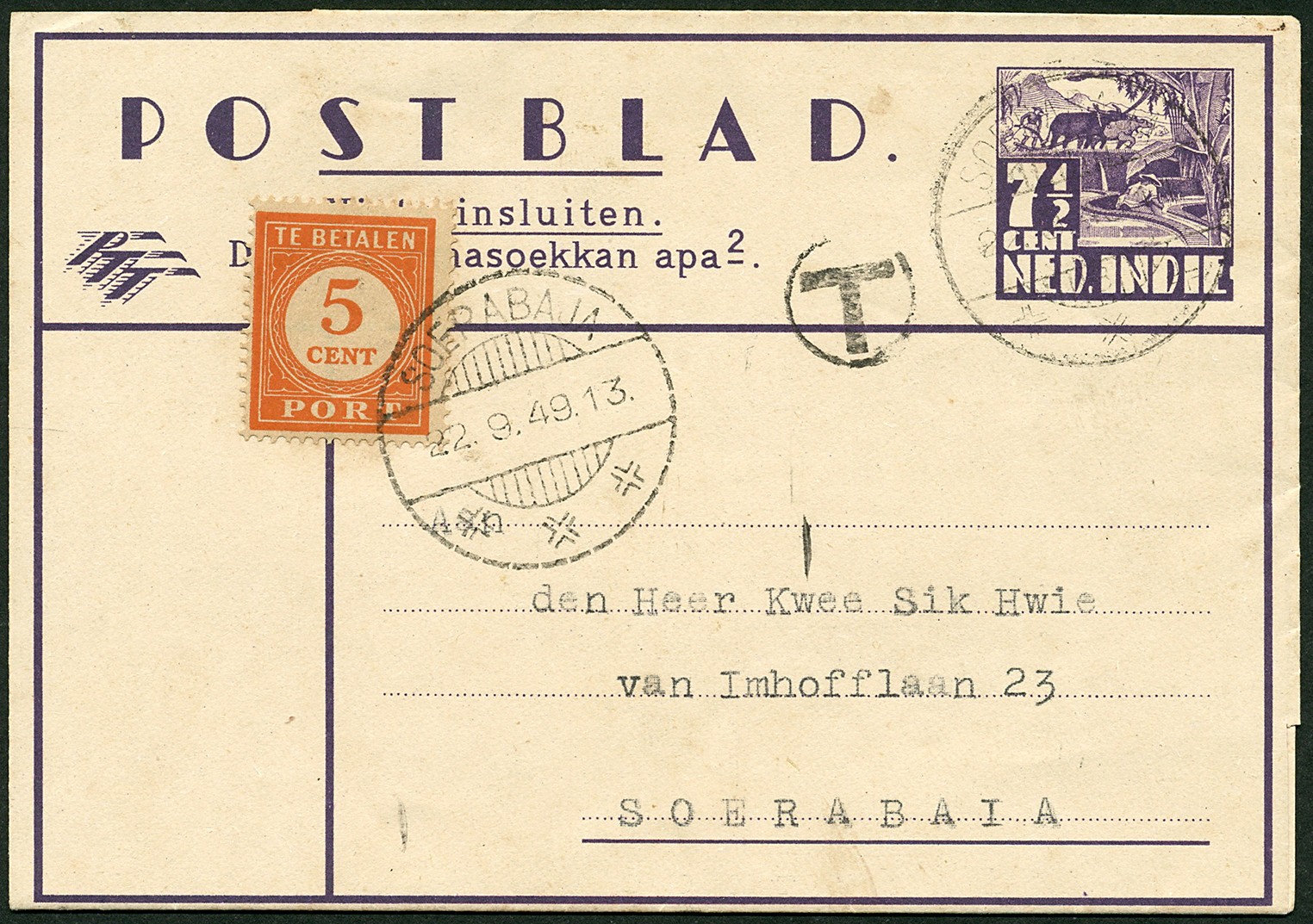 Beport. Pb. G5 (dichtgeplakt) lokaal verz. te Soerabaja 22-9-1949 en met 5c P56 beport omdat het tarief 10 cent was