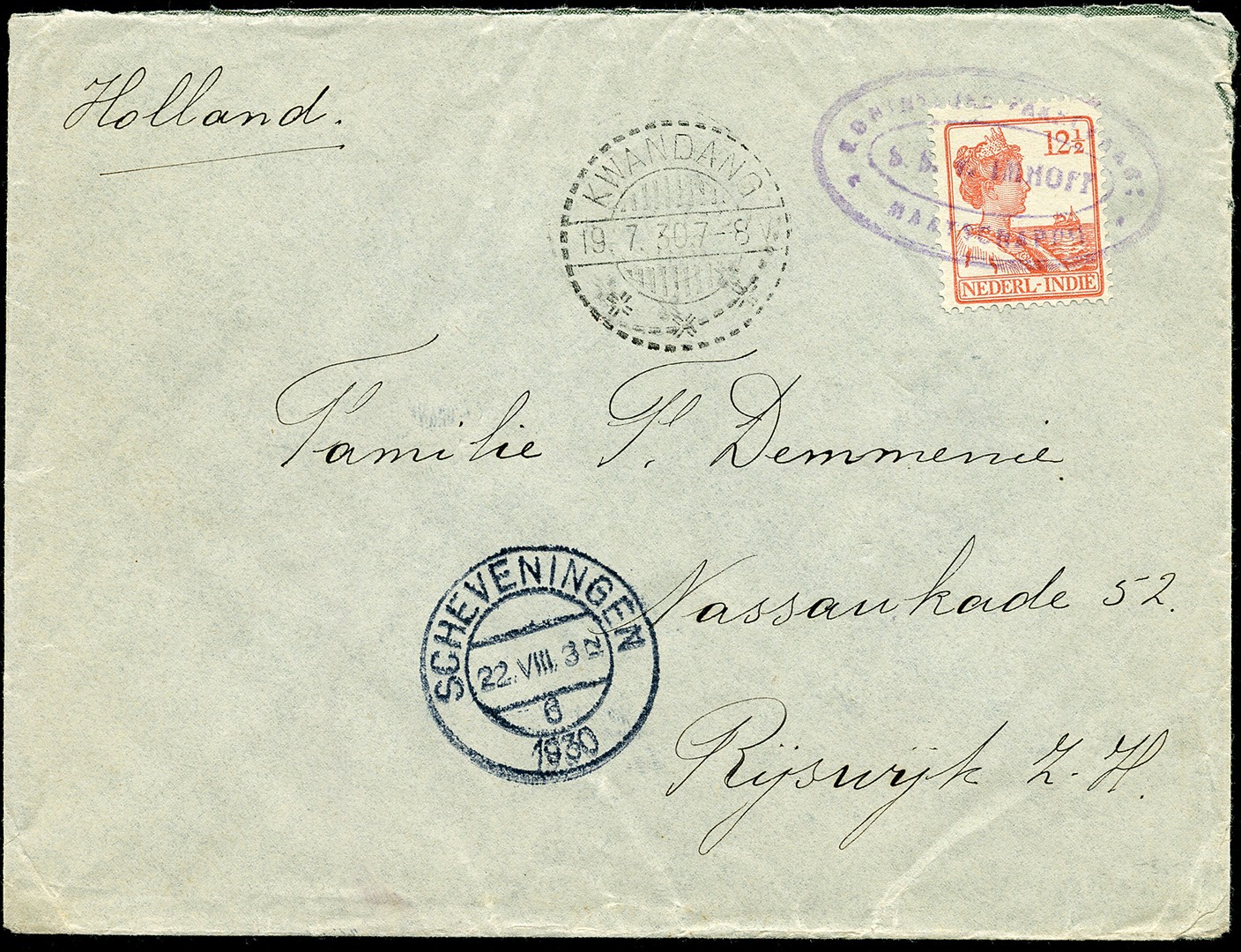Twee env. uit Noord-Celebes gefr. met 12½c afgest. met KPM-ovaalstempel 'S.S. v. IMHOFF' resp. KPM-naamstempel 'S.S. VAN IMHOFF', beide via Kwandang 1930 resp. 1934 naar Rijswijk