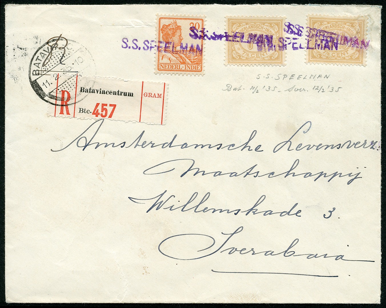Env. uit Tandjongkarang gefr. met 2x 7½c (1 ex. beschadigd) en 20c 4x afgest. met KPM-naamstempel 'S.S. SPEELMAN' en aangekomen te Bataviacentrum, daar op 11-2-1935 aangetekend, verz. naar Soerabaja 12-2. Aangetekende KPM-stukken zijn schaars. Ex Van Affelen van Saemsfoort