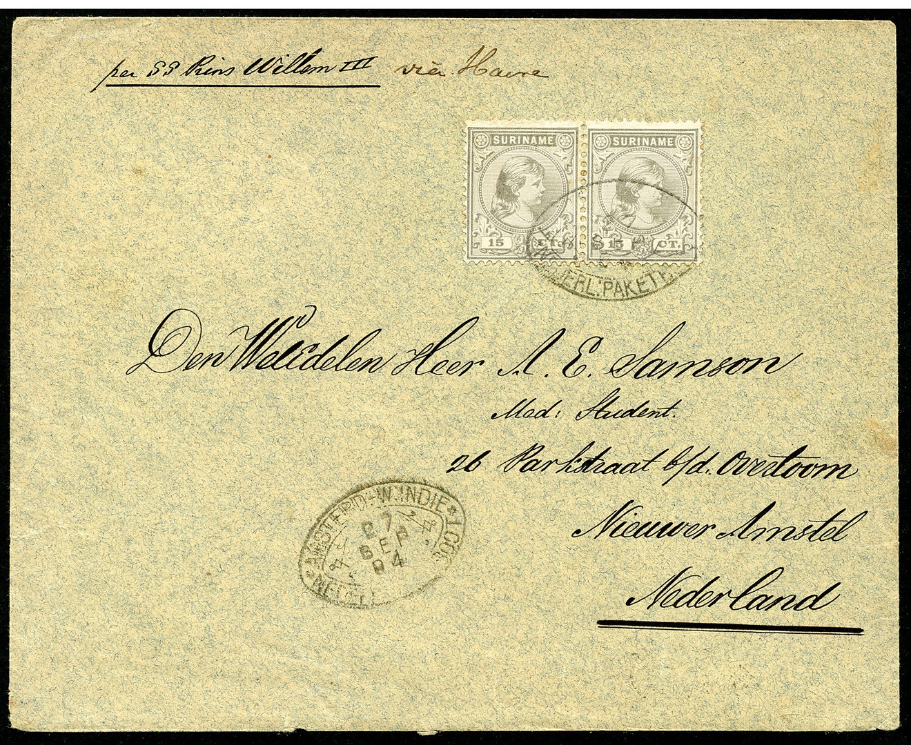 15 Cent Hangend Haar nr. 25 in prachtpaar op luxe couvert afgest. met KWIM-ovaalstempel op 27-9-1894 via Le Havre naar Amsterdam 28-9