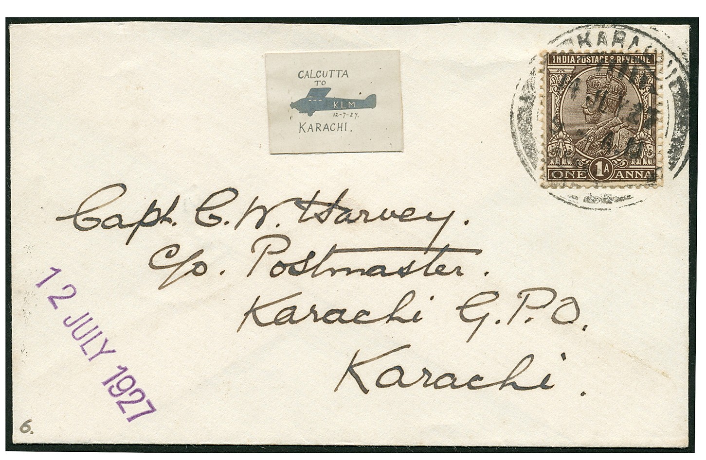 Chartervlucht van de krantenmagnaat Van Lear Black. Batavia via Bangkok, Calcutta en Karachi naar Amsterdam. Trajectpost. Couvert waarop strookje 'Calcutta to Karachi' 12-7-1927. Slechts 15 stuks gevlogen, waarvan dit nr. 6 is. Schaars! VH.B.13b. € 300