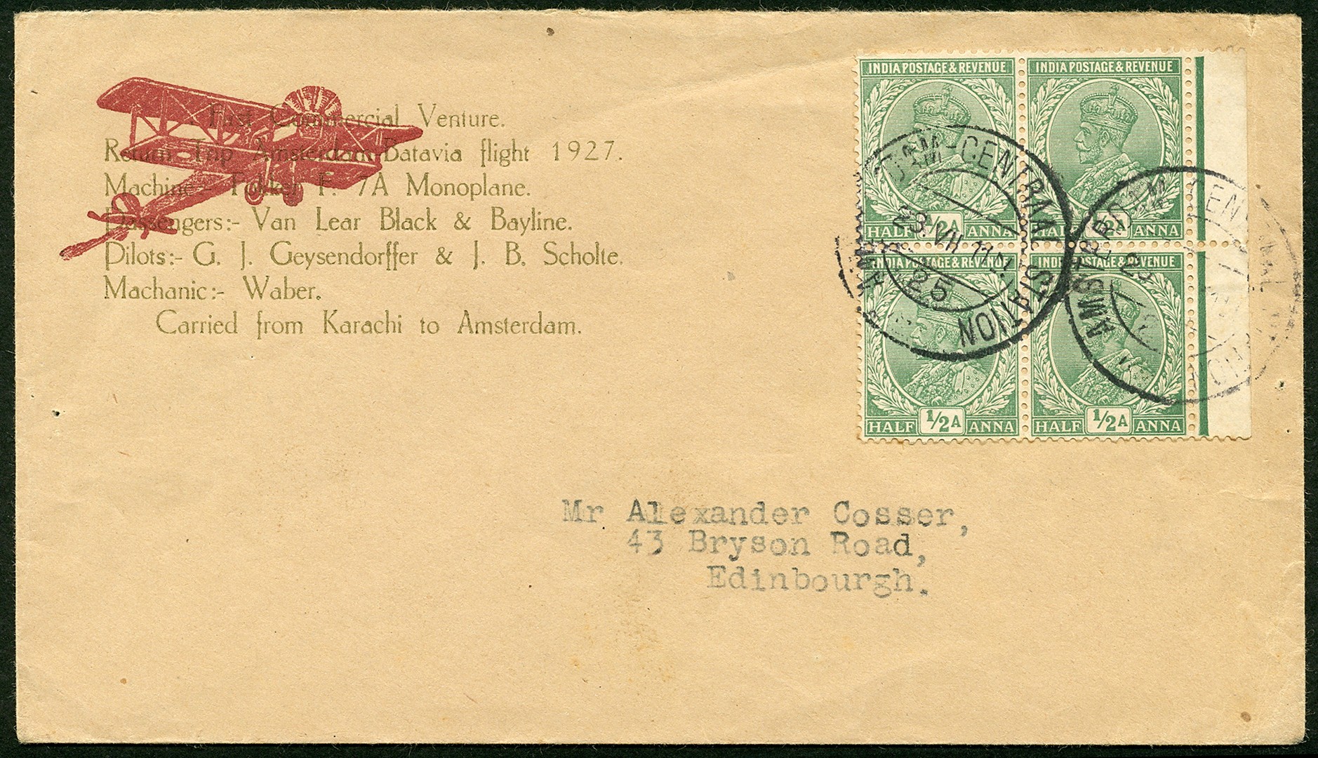 Chartervlucht van de krantenmagnaat Van Lear Black. Batavia via Bangkok, Calcutta en Karachi naar Amsterdam. Trajectpost. Bijzonder couvert, zegels pas te Amsterdam C.S. op 23-7-1927 afgest. en verder naar Edinburgh. Slechts 33 stuks gevlogen. VH.B.13b. € 250