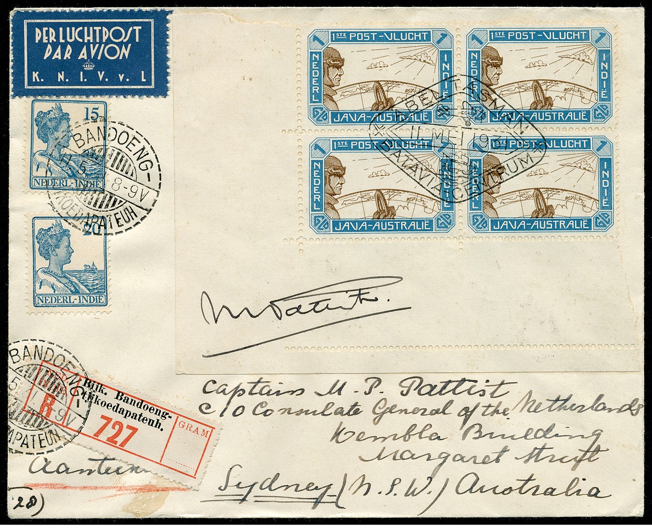 Ned.- Indië. Pattistvlucht. Pattistzegel in hoekblok van vier met ruitstempel, alsmede handtekening van Pattist op de velrand, op couvert, ook al van M.P. Pattist (Riouwstraat 163, Bandoeng), bijgefr. met 15c en 20c als R-poststuk uit Bandoeng- / Tjikoedapateuh 11-5-1931 naar Sydney 18-5. VH.C.90-Ie
