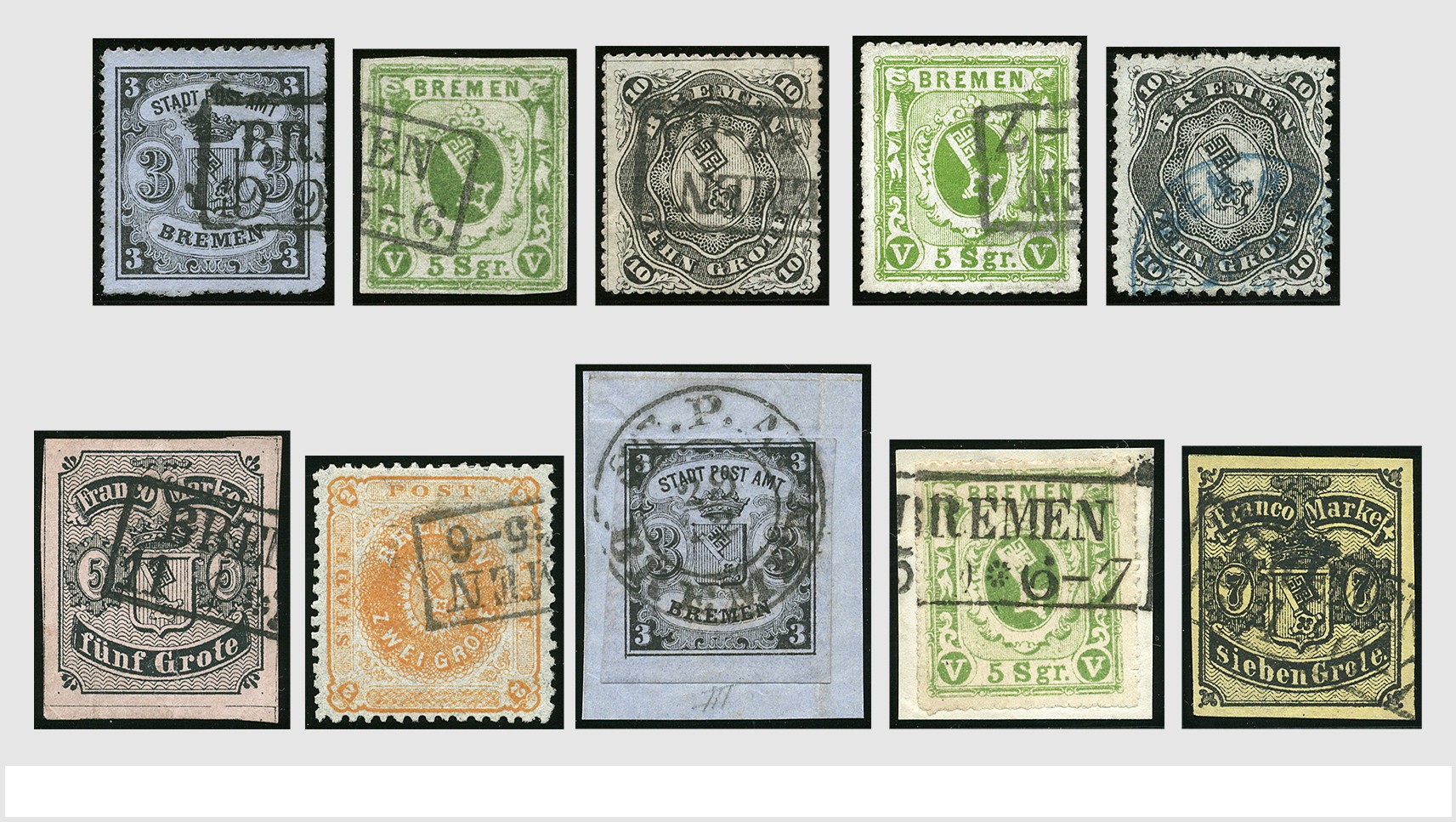 BREMEN 1855/67, gestempelte Sammlung mit Mi.Nr. 1y, 2, 3b, 4a, 4b, 4c, 6x, 7, 8, 9b, 10a, 11 und 14, fast jede Marke geprüft oder mit Befund/Attest Fischer, Bühler und Neumann, gute Erhaltung. (Mi. 8100,=)