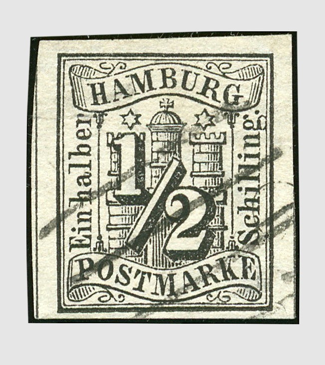 HAMBURG 1, ½ Schilling schwarz, farbfrisch, allseits breitrandig mit sauber aufgesetztem Strichstempel, signiert Jakubek BPP € 750,=