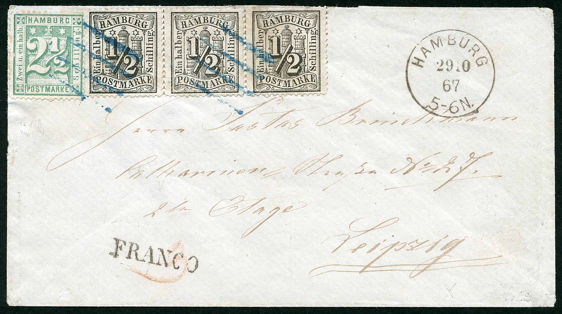 HAMBURG (10, 14II), ½ Schilling schwarz im waagerechten Dreierstreifen zusammen mit 2½ Schilling dunkelopalgrün auf korrektem 4-Sch.-Frankatur-Brief mit sauber aufgesetztem blauen Strichstempel und späten Einkreizer "HAMBURG 29.10.67" und schwarzem Franco-Stempel nach Leipzig, signiert Jakubek