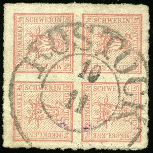 MECKLENBURG-SCHWERIN 4, Wappen auf punktiertem Grund, durchstochen: 4/4 Schilling graurot, farbfrisch und tadellos durchstochen mit zentrisch sauber aufgesetztem DKr. "ROSTOCK 10/11". Ein schönes Stück in tadelloser Erhaltung, Attest Pfenninger (1957) € 2400,=