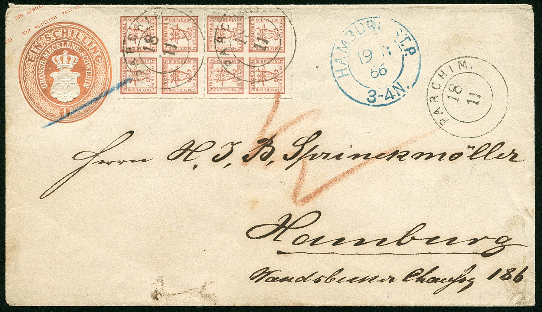MECKLENBURG-SCHWERIN 5, 4/4 Schilling bräunlichrot mit DKr. "PARCHIM 18/11", als Zusatzfrankatur auf Ganzsachenumschlag Mi.Nr. U9, 1 Schilling ziegelrot nach Hamburg. Portogerechter Brief in einwandfreier Erhaltung mit Farbfotoattest Berger (2003)