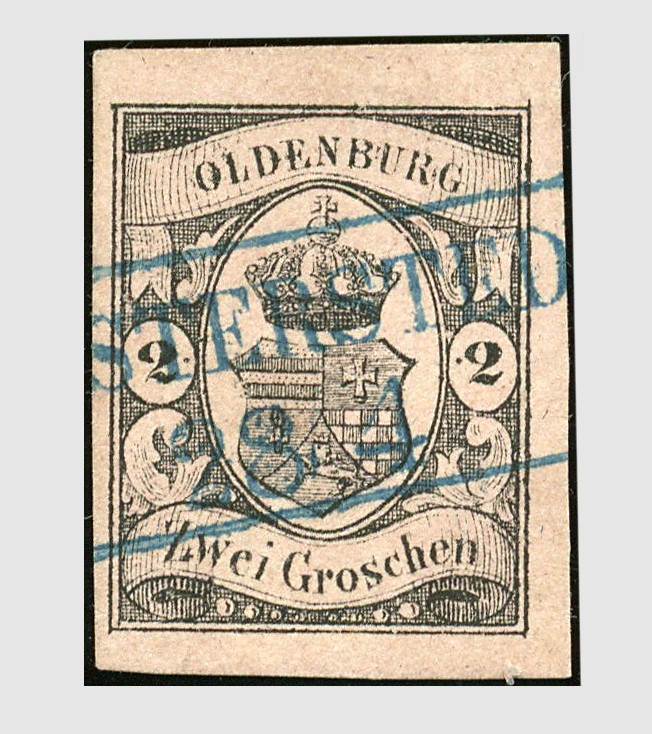 OLDENBURG Mi.Nr.7, 2 Groschen schwarz auf mattrötlichkarmin, farbfrisch und allseits breitrandiges Prachtstück mit leicht aufgesetztem Ra2 "WESTERSTEDE 28.4", einwandfreies Prachtstück mit Fotobefund Berger (2000). € 750,=
