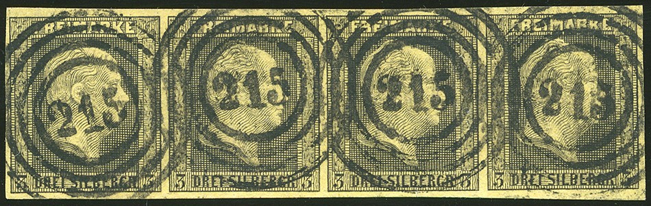 PREUSSEN 4, 3 Silbergroschen gelb, waagerechter Viererstreifen, farbfrisch und allseits breitrandig mit sauberem Vierringstempel "215" von BRUGSTEINFURT, tadellose Erhaltung. Luxus! € 600,=