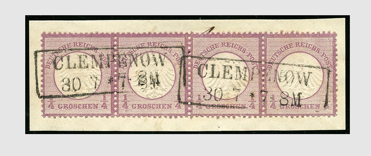 DEUTSCHES REICH 1(4), ¼ Groschen graupurpur, waagr. Viererstreifen auf Briefstück, farbfrisch, sehr gut geprägt und gezähnt, sauber entwertet durch R2 "CLEMPENOW 30 7 7-8M", sehr gute Gesamterhaltung, signiert Schmitt und Kruschl und Farbfotoattest Brugger BPP (2001) € 800,=