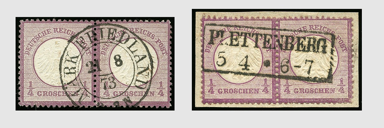 DEUTSCHES REICH 1(4), ¼ Groschen violett, kleiner Schild, im waagr. Paar mit zentrischem DKr. "MÄRK.FRIEDLAND 21.8.73" und im waagr. Paar auf Briefstück mit R2 "PLETTENBERG 5 4 * 6-7". Beiden Paare farbfrisch, sehr gut geprägt und zentriert, tadellose Erhaltung mit Attest Hennies und Sommer