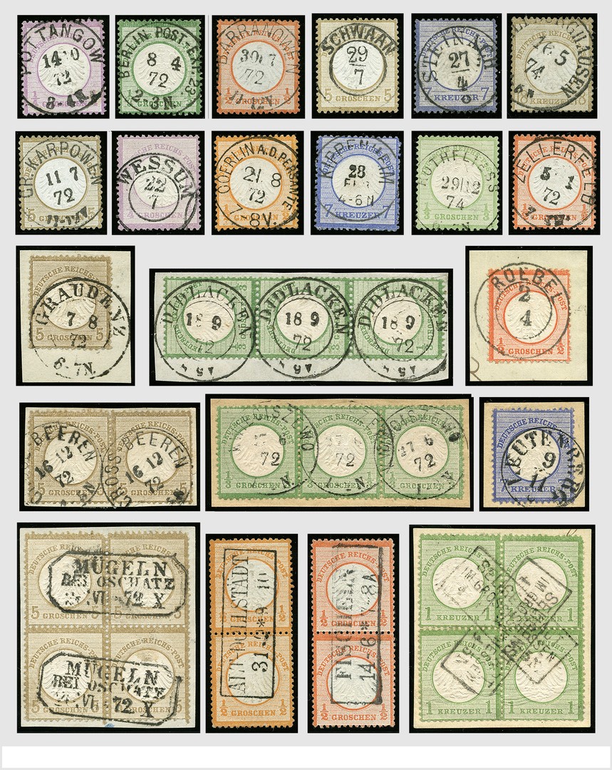DEUTSCHES REICH 1872-1875, Brustschild-Sammlung, Mi.-Nr. 1-15, kleines Brustschild, nach Stempel gesammelt in meist perfekter Qualität, vieles geprüft oder mit Befund bzw. Attest, dabei Einzelmarken/Briefstücken, Paare, Dreier- und Viererstreifen und Viererblöcke, Briefe/Ganzsachen, dabei Dreier- und Viererstreifen und Mehrfachfrankaturen. Eine wunderschöne Sammlung