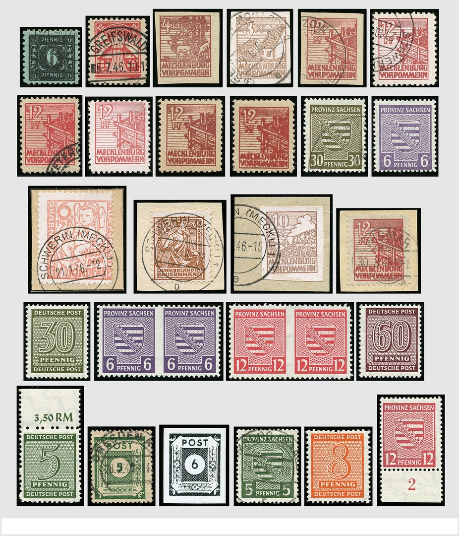 SBZ Mecklenburg-Vorpommern, Ost- und West Sachasen und Thüringen, postfrischer, ungebrauchter und gestempelter Sammler-Bestand mit u.a. postfrisch: 2AuxU, 5AAuxU, 31yb, 32xb, 36xcc, 36yd, 36ydd, 37zbb, 43Ac, 69XBUMs, 71XBUMs, 79Yb, 116Ay-119Ay, 159yIIim Paar, Bl.5Ya und gestempelt: 1B-7B, 13y, 14y, 15b, 18IId, 24c, 26b, 35xb, 36xc, 36ydU, 36ydd, 36zb, 36yf, 37yd, 40yb, 51blx, 57b, 83xb, 75Yb, 78Yb, 97AXbat, 135Yb und 137Yb. Fast alle geprüft bzw. Befund/Attest BPP. Ein sehr schöner Bestand im Einsteckbuch mit einem Kat.-Wert von über € 35.000,=