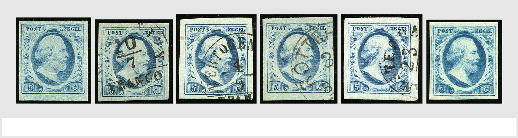 EMISSIE 1852. 5 Cent 131x los waarvan 2 ex. ongebruikt doch zonder gom, alsmede 2 paren, diverse platen en kleurnuances, veel gepositioneerd en prachtex. w.o. breed tot zeer breed gerand, rand- en hoekstukken