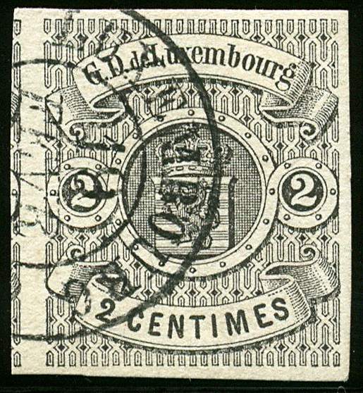 BUREAU DE LUXEMBOURG-VILLE, Mi.4, 2 centimes 'noir', grandes marges (voisin), oblitération petit cachet à date LUXEMBOURG 19 FEVR .., Superbe. Mi.4, 2 cts 'schwarz' breitrandiges Prachtstück mit Teil der Nebenmarke, entwertet mit DKr. LUXEMBOURG 19 FEVR .., tadellose Erhaltung, sign. Ungeheuer, Roumet und cert. Goebel (2010)