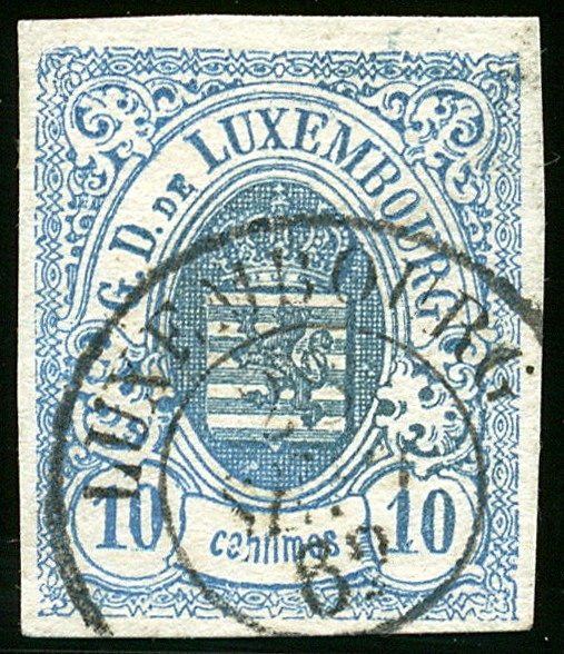 BUREAU DE LUXEMBOURG-VILLE Mi.6, 10 centimes 'bleu-noir', oblitération Luxembourg avec cachet à date, TB Mi.6, 10 cts 'schwarzblau', entwertet mit DKr. von Luxemburg-Stadt, tadellose Erhaltung.