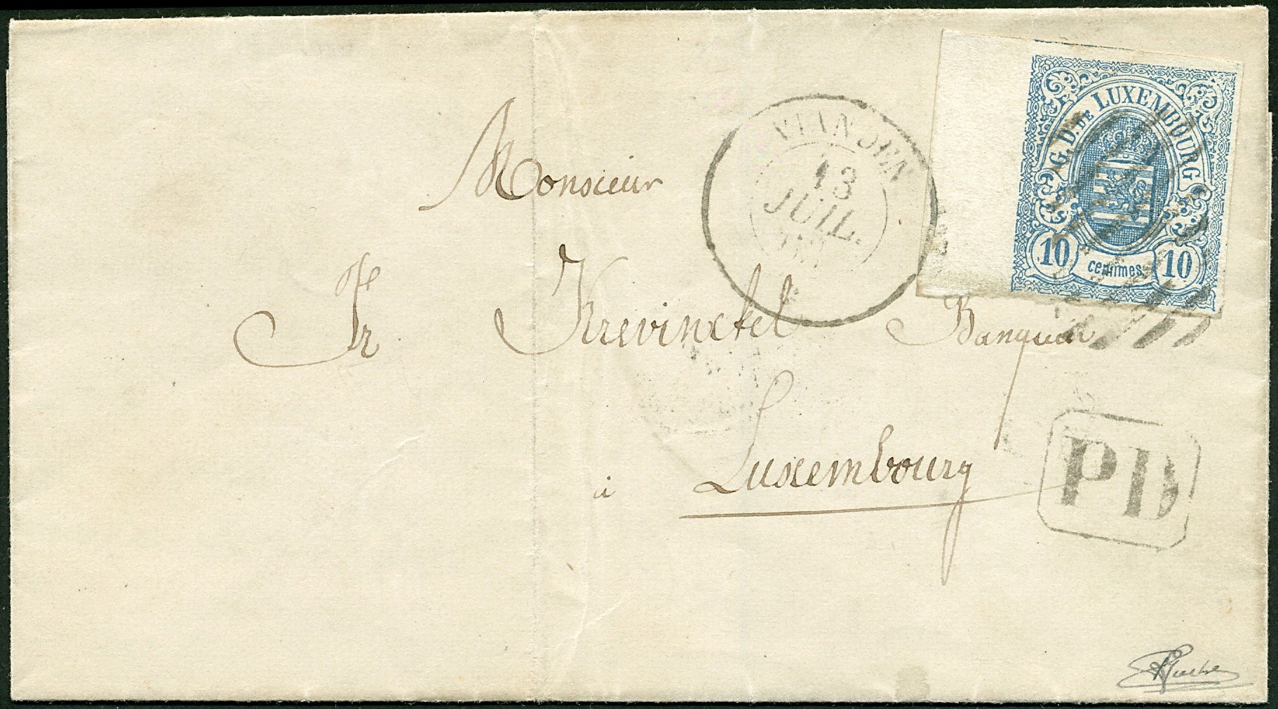 BUREAU DE VIANDEN, Mi.6, 10 centimes 'bleu', grand bord de feuille, sur lettre pour Luxembourg, oblitération rurale à 10 barres et c.à.d. VIANDEN 13/JUIL/63. Cert. Goebel (2012): .. "La plus belle des 2 lettres connues" . Superbe Mi.6, 10 cts 'blau', grosser linker Bogenrand, auf Brief nach Luxemburg, entwertet mit 10 rechteckigem Balken und DKr. VIANDEN 13/JUIL/63. Cert. Goebel (2012): .."sehr selten. Nur 2 Briefe bekannt" Kabinett!