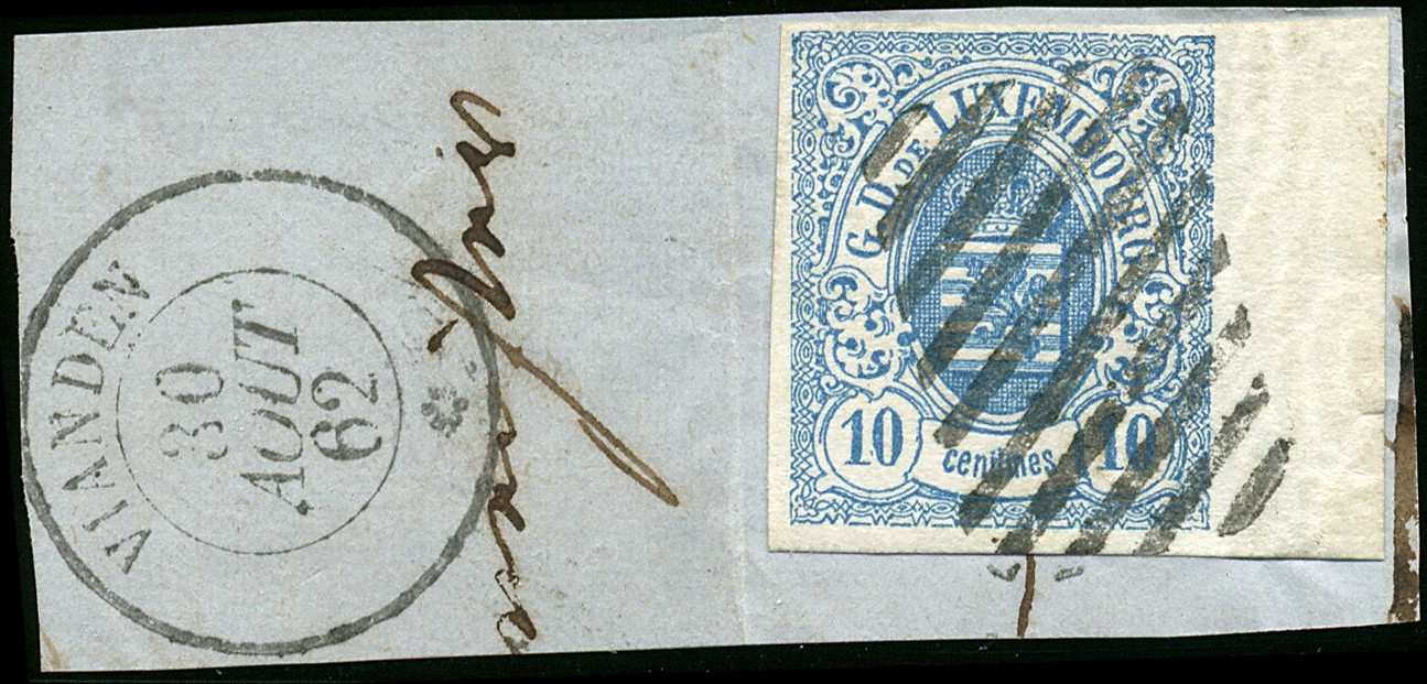 BUREAU DE VIANDEN, Mi.6, 10 centimes 'bleu', grand bord de feuille, sur fragment, oblitération rurale à 10 barres et c.à.d. VIANDEN 30/AOUT/62. Superbe. Mi.6, 10 cts 'blau', grossen rechten Bogenrand, auf Briefstück, entwertet mit 10 rechteckigem Balken und DKr. VIANDEN 30/AOUT/62. Luxusstück! Sign. FSPL und Cert. Goebel (2012)