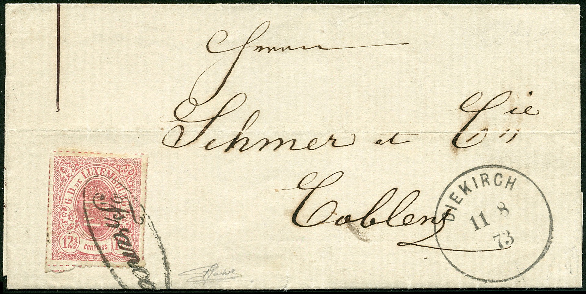 BUREAU DE DIEKIRCH, Mi.18, 12½ centimes 'rose', sur lettre en port payé pour Coblenz, oblitération avec cachet oval "FRANCO", et c.à.d DIEKIRCH 11 8/73. (Port 1er rayon pour l'Allemagne) Mi.18, 12½ cts 'rosa' auf Brief mit Porto bezahlt nach Koblenz, entwertet mit ovalem "FRANCO"-Stempel und Kreisstempel DIEKIRCH 11 8/73 (Porto 1e Zone nach Deutschland). Cert. Goebel (2014)