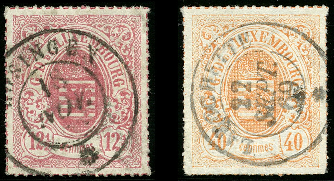 BUREAU DE HOSINGEN et BUREAU DE LAROCHETTE , Mi.18, 12½ centimes 'carmin', et Mi. 23, 40 cts 'rouge-orange' oblitération avec c.à.d. Mi.18, 12½ cts 'karmin', und Mi.23, 40 cts 'rotorange' entwertet mit Dkr. Hosingen und Larochette. Tadellose Erhaltung. Sign. Goebel