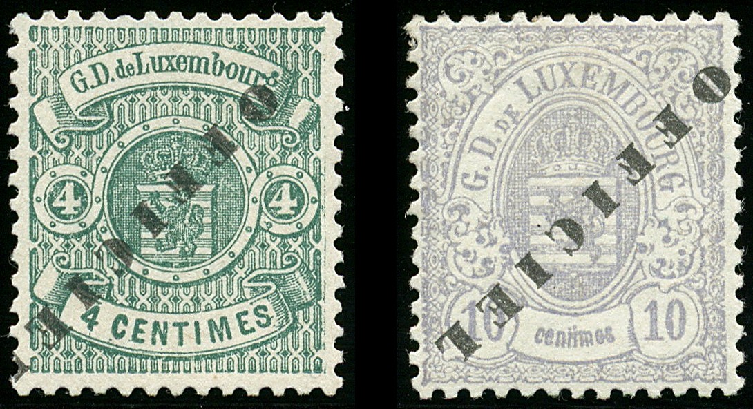 1878 - EMISSION AUX ARMOIRIES DENTELEES NEUFS OFFICIEL (Type II avec impression locale), Mi.12IIB, 4 centimes 'vert' (*) et Mi.14IIB, 10 centimes 'gris' *, les deux avex surcharge renversée, TB Mi.12IIB, 4 cts 'grün' (*) und Mi.14IIB, 10 cts 'grau' *, ungebraucht mit spiegelverkehrtem Aufdruch. Tadellose Erhaltung, Befund Goebel (2009 und 2013)