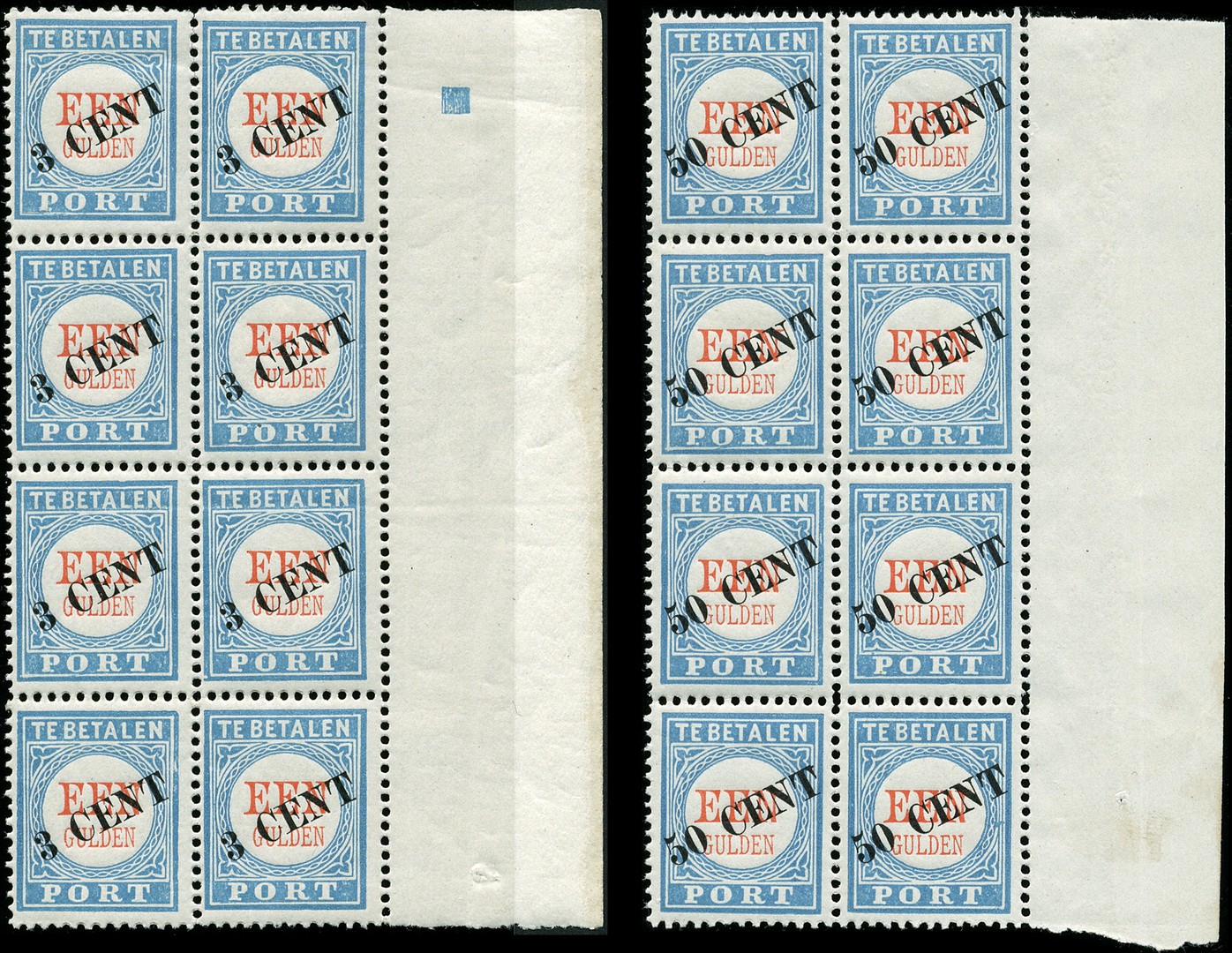 27/28, 3 cent op Een gulden en 50 cent op Een gulden, type III, in postfrisse prachtblokken van acht. € 6400