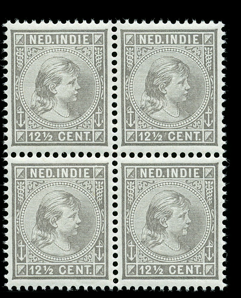 23/24, 10 Cent roodbruin en 12½c grijs, postfrisse prachtblokken van vier. € 320+