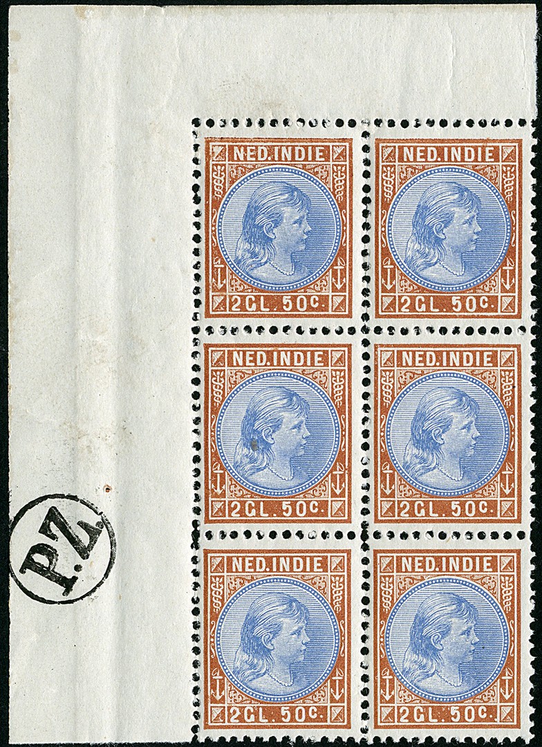 30, 2,50 Gulden oranjebruin en lichtblauw, prachtig hoekblok van zes met volle, originele gom en postfris en stempelafdruk 'P.Z.' in cirkel op velrand. Zeer fris van kleur en zeldzaam als eenheid en vooral in deze kwaliteit! € 3900+
