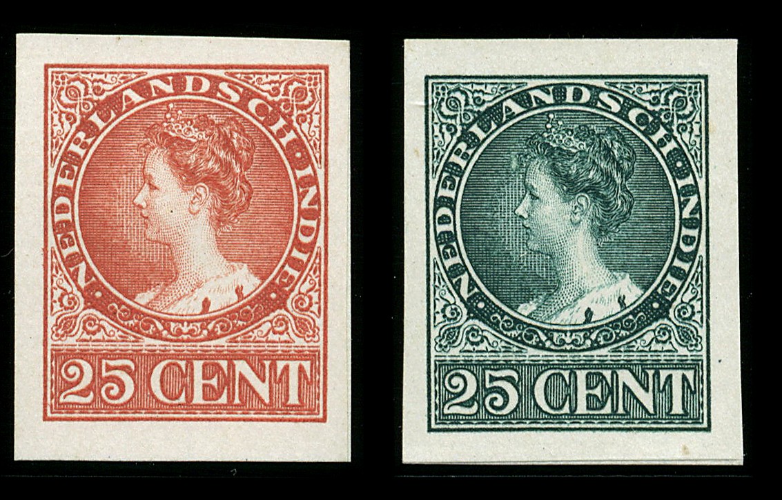 Emissie Veth. Kleurproeven in de waarde 25 cent van een niet goedgekeurd ontwerp van prof. J. Veth, genomen van de plaat, ongetand, op wit papier, geplakt op geruit papier, PC.57. 16 verschillende kleuren/kleurnuances. f 480