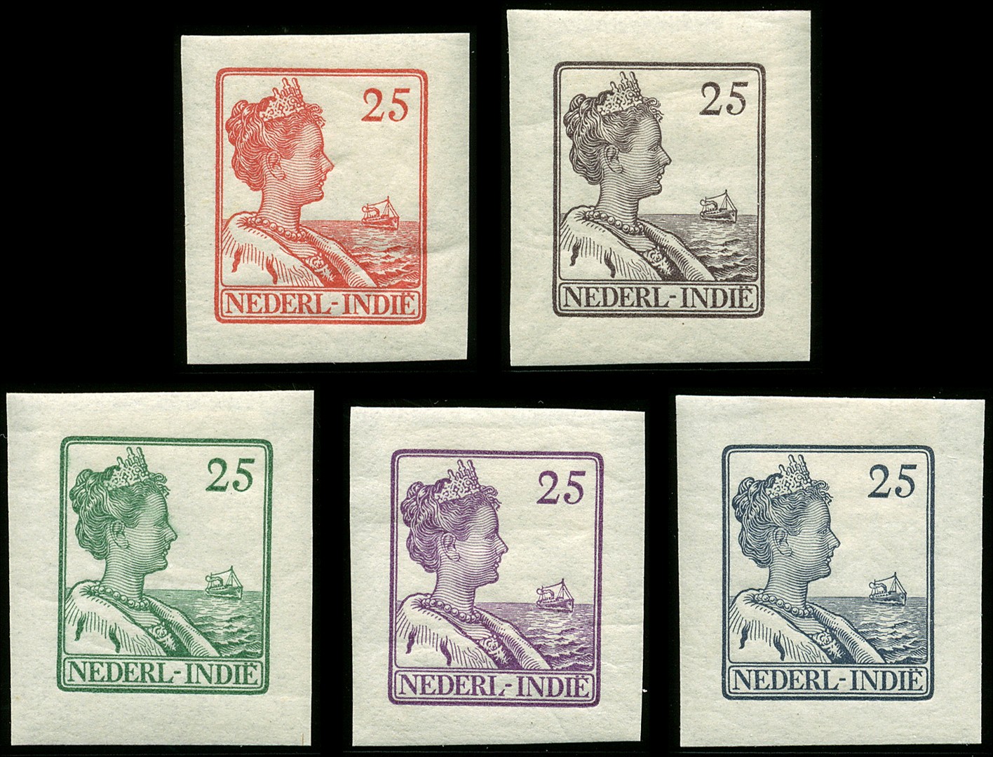 Emissie Wilhelmina met scheepje. Kleurproeven van de niet goedgekeurde, zogeheten derde tekening, met in het gelaat lijnen i.p.v. punten, en met een lijn tussen de masten, op klein velletje gegomd papier, ongetand, PC.80. 29 Verschillende kleuren/kleurnuances. Slechts hoogst zelden aangeboden! f 2900