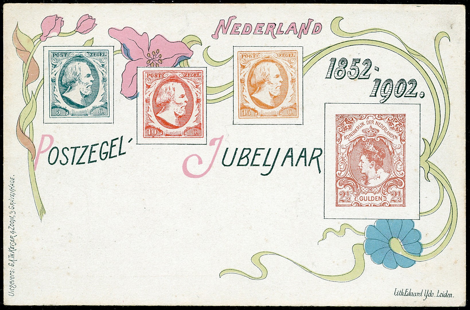 Bijzondere, niet verzonden prentbriefkaart 'Postzegel Jubeljaar 1852-1902', uitgeven door G.A.Th. Keiser & Zoon, 's-Gravenhage