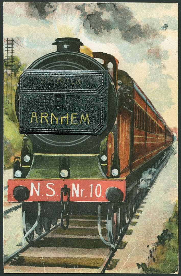 Prachtige niet verzonden prentbriefkaart van een trein voortgetrokken door een stoomloc waarop bevestigd een lederen tas, waarin een serie fotootjes van Arnhem