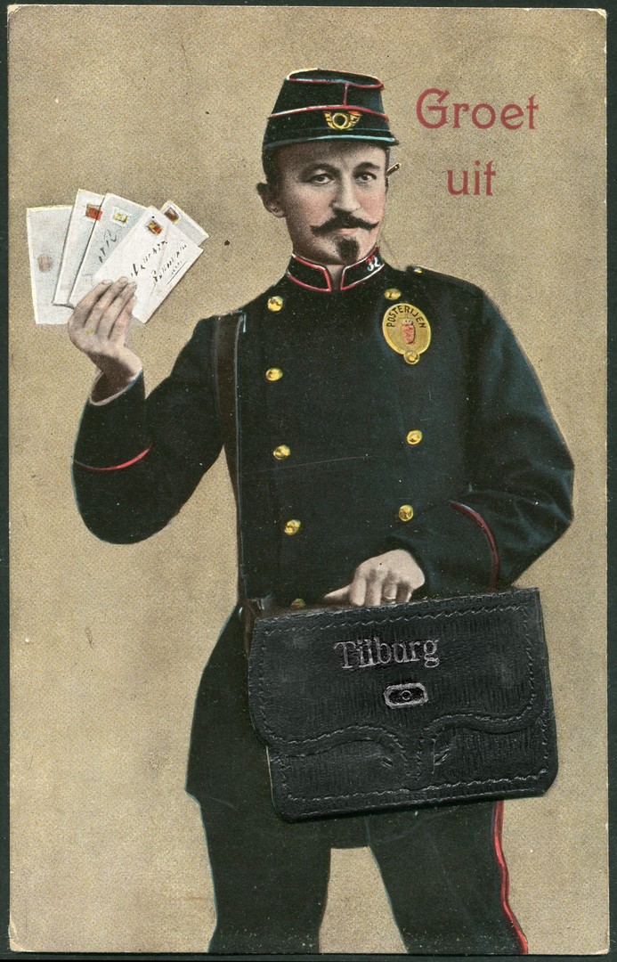 Mooie prentbriefkaart van besteller met lederen tas, waarin een serie fotootjes van Tilburg, van Tilburg 11-6-1910 naar een mejuffrouw in Eersel 11-6