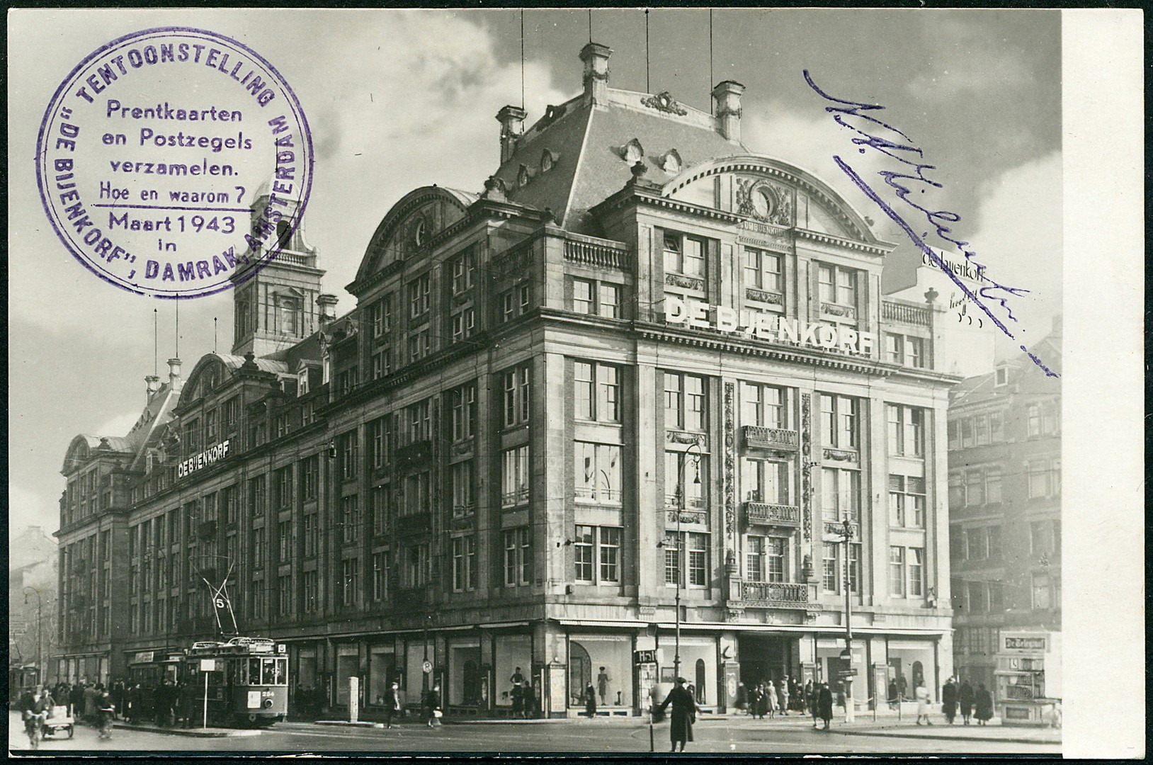Prentbriefkaart, niet verzonden, voor de Tentoonstelling 'Hoe en Waarom' Postzegels Verzamelen, Maart 1943 in De Bijenkorf te Amsterdam, waaruit blijkt dat het filatelistische leven tijdens de oorlogsjaren ogenschijnlijk gewoon doorging