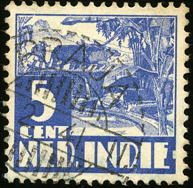 Langebalk PRAJA op 5c nr. 251. Prima ex. met grootste deel van de afst. waarin volledige kantoornaam en datum 2.41. Slechts enkele vooroorlogse afdrukken bekend van dit hulppostkantoor op Lombok. € 700