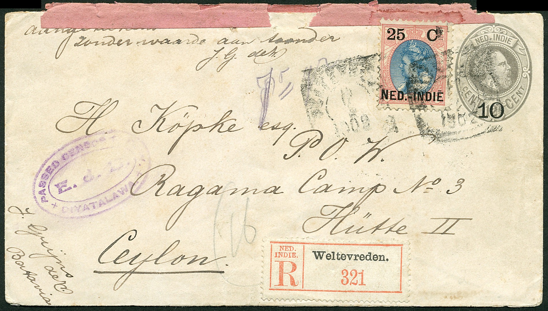 AZIË. CEYLON. Env. G10 bijgefr. met 25c nr. 35 op gecensureerde env. van Weltevreden 12-2-1902 aangetekend naar een krijgsgevangene in het Diyatalawa Camp te Ragama 21-2
